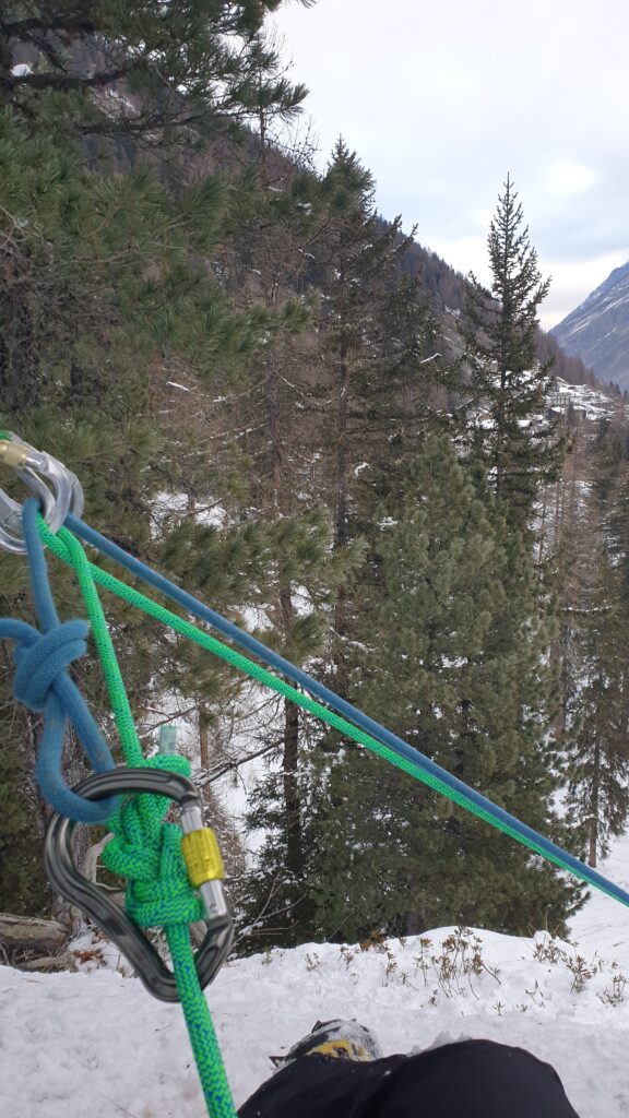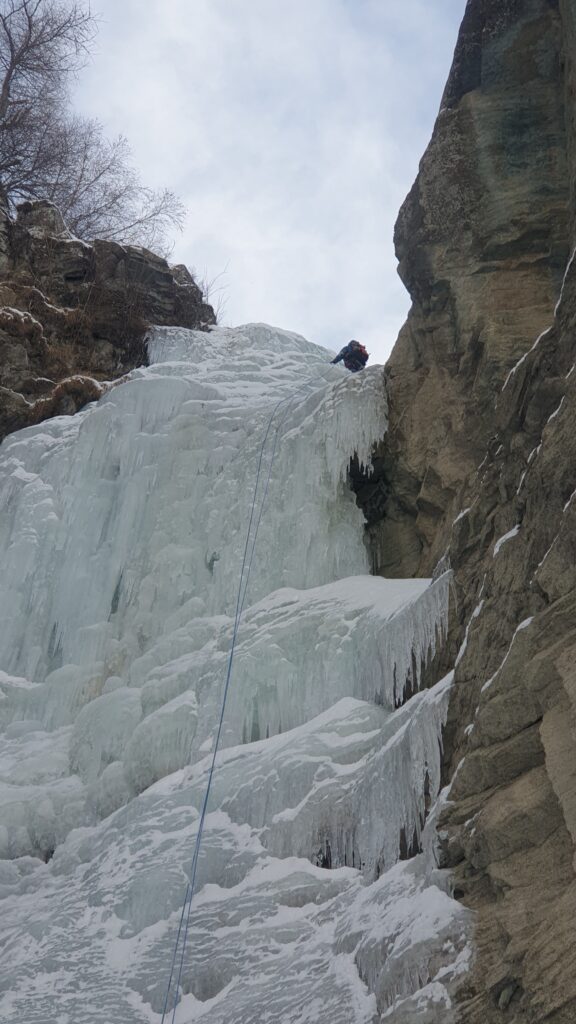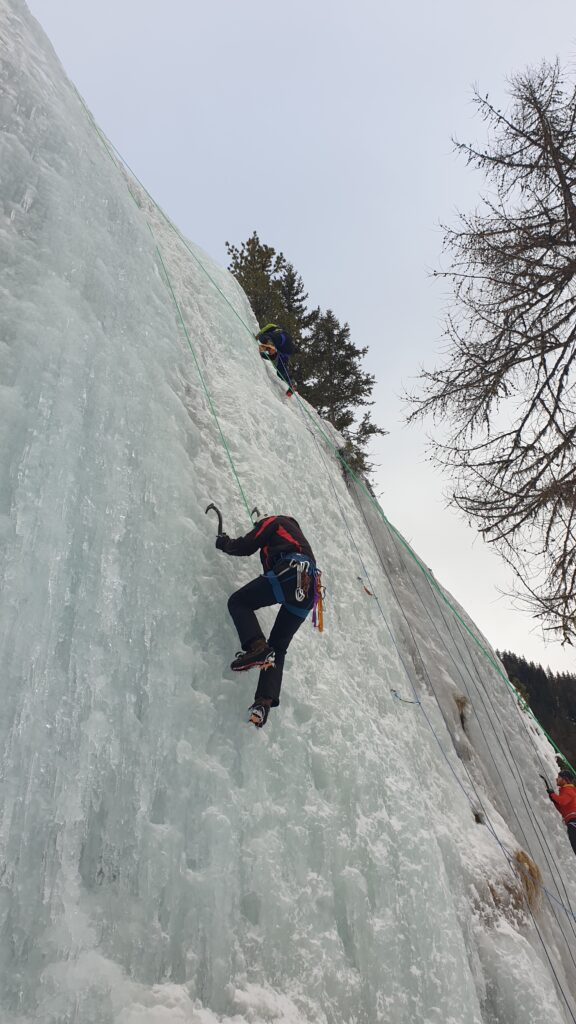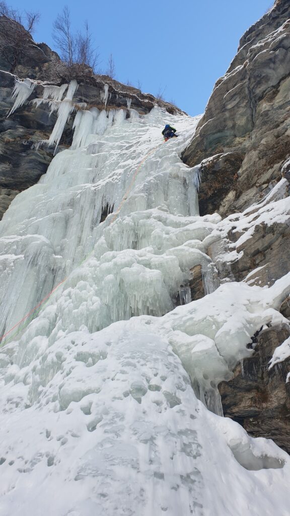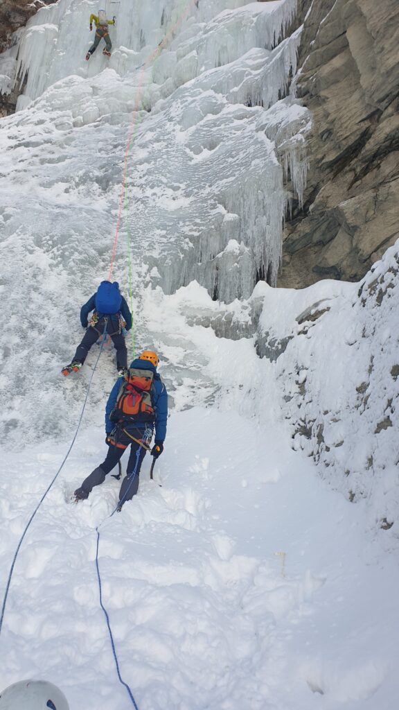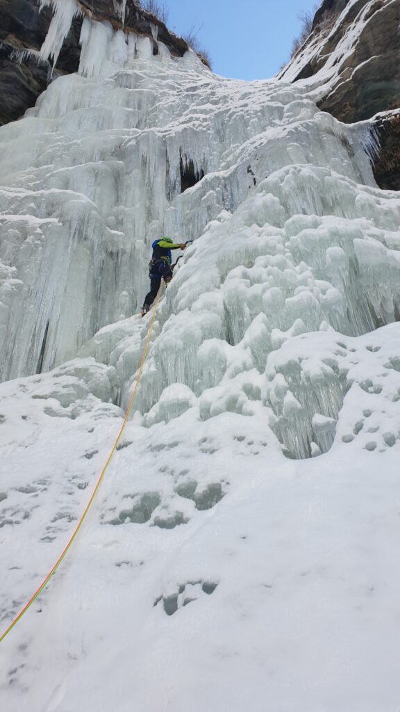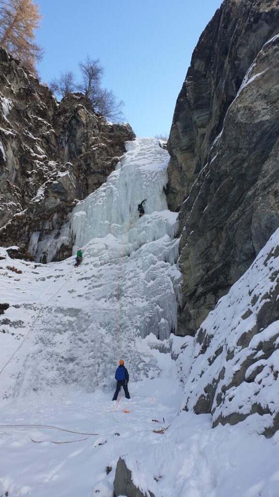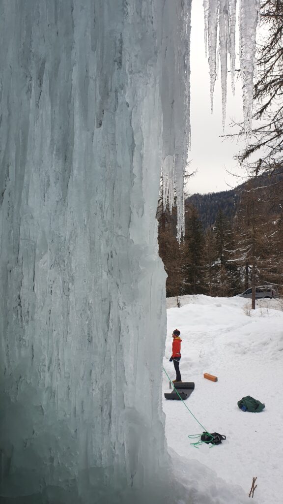 En fin du matinée, nous nous intégrons au paysage des grimpeurs italiens déjà sur place avec la température a peine négative et avec une ambiance ludique et scolaire pour nous rappeler ensemble des bons gestes sur la cascade de glace. La grimpe se poursuivra toute l’après-midi avec des petites pauses pour manger et pour prendre quelques photos souvenir.