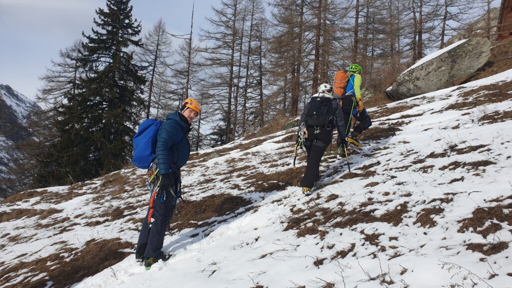 Jour 2 : La préparation matinal du matériel et le départ en direction de la vallée de Chamonix. Les séances de photos/vidéo avant et après le tunnel du Mont Blanc suivi d’un arrêt au Bar Pâtisserie « Pilier Centrale » pour déguster des glaces magnifiques. La route nous emmène ensuite dans la vallée de Valsavarenche en direction de la montagne mythique « Grand Paradizio ». Les villages Rovenaud et Degiz nous font découvrir la splendeur de ces lieux, avec cette ambiance hivernale et le « Jardin des glaces » aménagé pour permettre aux débutant de découvrir sur place les techniques de grimpe en sécurité complète tant crainte par quelques camarade de notre cordée.